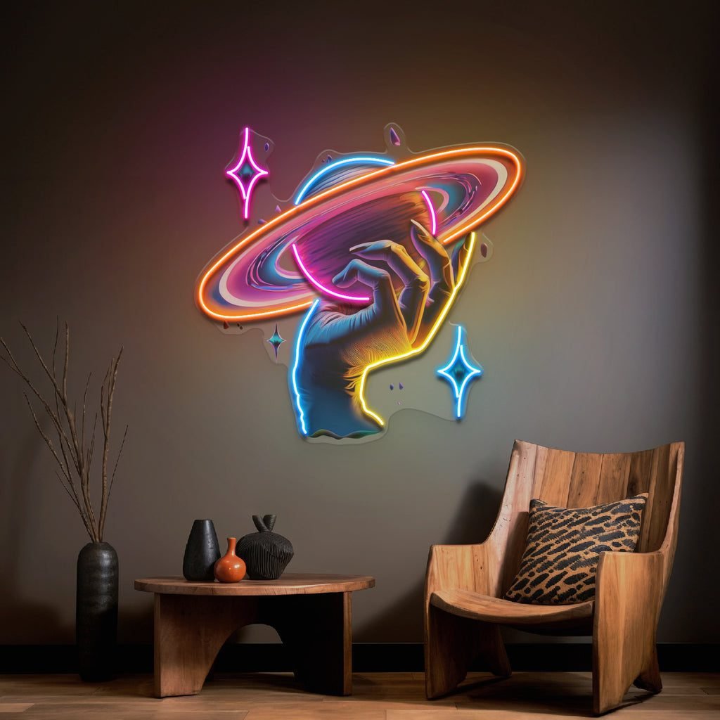 Hand Holding Saturn In Galaxy Art Style LED Neon Sign Light Pop Art