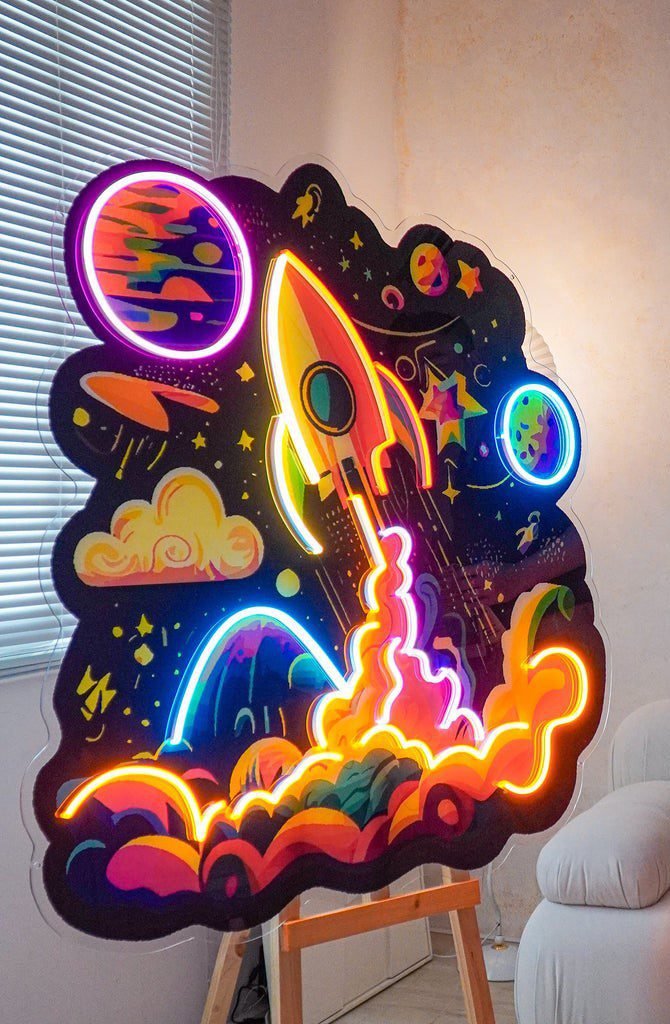Rocket Launching Into Galaxy LED Neon Sign Light Pop Art